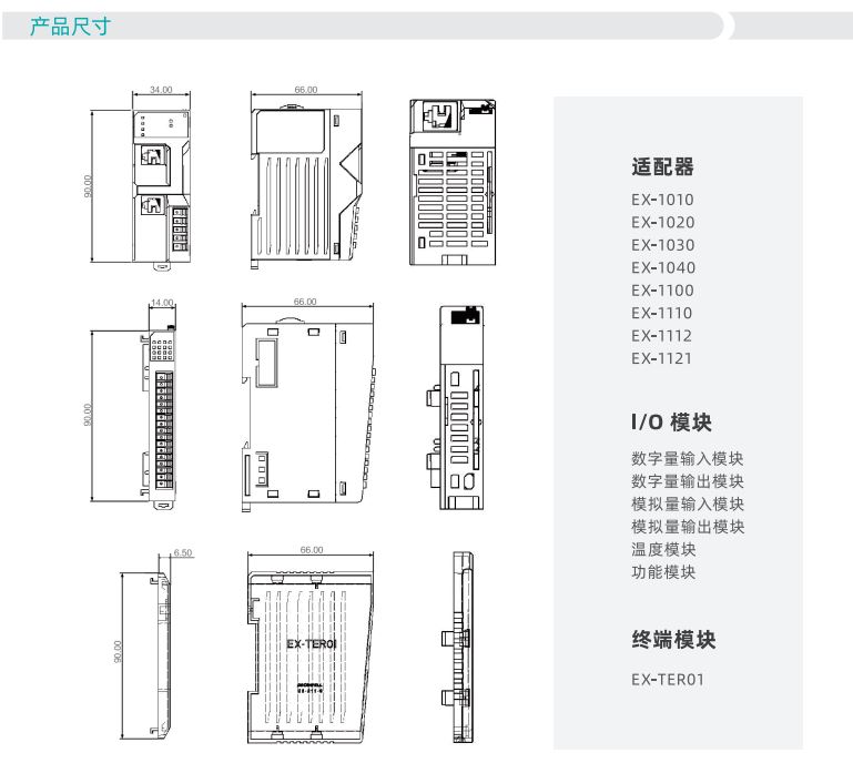 EX系列卡片式I/O模块由适配器模块、I/O模块、电源模块、终端模块组成。适配器可支持多种通讯总线,例如PROFINET、EtherNet/IP、EtherCAT、 DeviceNet 、Modbus RTU、PROFIBUS-DP 等等适配器模块通过将标准的通讯总线转换成本产品模块的通讯总线,用于扩展不同类型和数量的I/O模块。I/O模块可分为数字量输入模块、数字量输出模块、模拟量输入模块、模拟量输出模块以及功能模块。用户可以根据现场的实际需求进行搭配其中数字量输入模块、I/O模块和模拟量输入模块端口处设计有对外的供电接口,可以为现场的传感器提供电源无需另外增加端子排,可支持两线制和三线制传感器。单个模块I/O点数最大为32个点,单个适配器最大可扩展32个I/O模块。模块上设计有丰富的诊断功能以及状态指示,用户可以非常容易的识别模块当前的运行状态