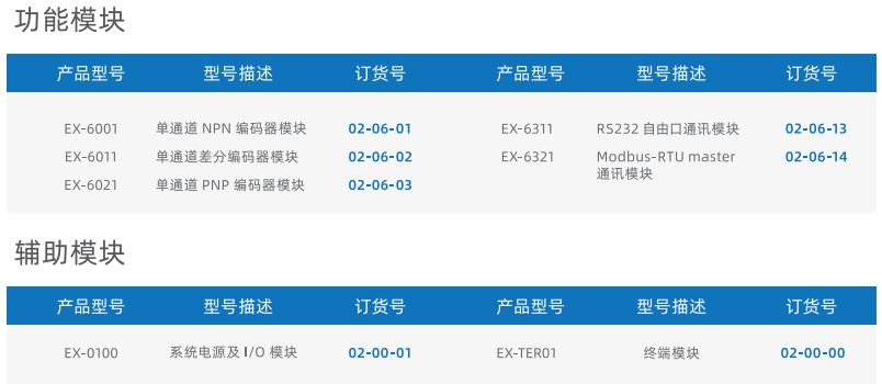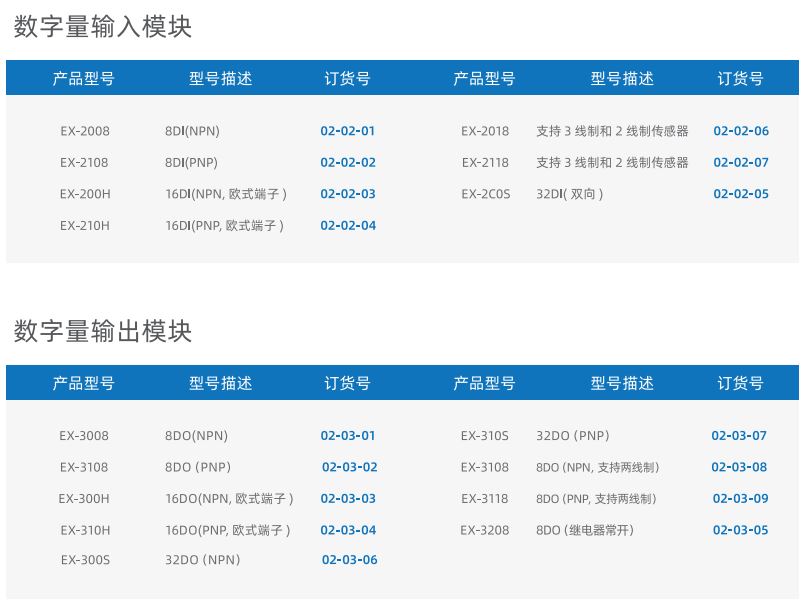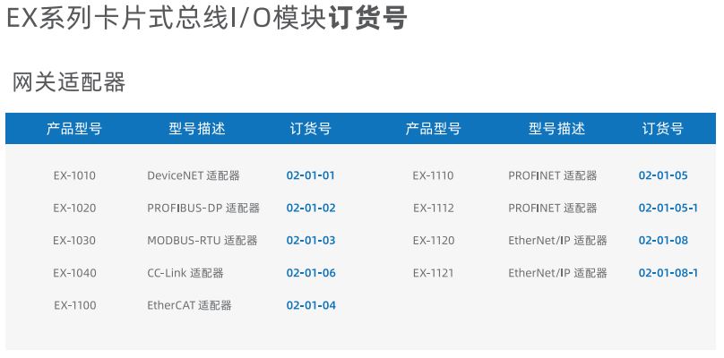 EX系列卡片式I/O模块由适配器模块、I/O模块、电源模块、终端模块组成。适配器可支持多种通讯总线,例如PROFINET、EtherNet/IP、EtherCAT、 DeviceNet 、Modbus RTU、PROFIBUS-DP 等等适配器模块通过将标准的通讯总线转换成本产品模块的通讯总线,用于扩展不同类型和数量的I/O模块。I/O模块可分为数字量输入模块、数字量输出模块、模拟量输入模块、模拟量输出模块以及功能模块。用户可以根据现场的实际需求进行搭配其中数字量输入模块、I/O模块和模拟量输入模块端口处设计有对外的供电接口,可以为现场的传感器提供电源无需另外增加端子排,可支持两线制和三线制传感器。单个模块I/O点数最大为32个点,单个适配器最大可扩展32个I/O模块。模块上设计有丰富的诊断功能以及状态指示,用户可以非常容易的识别模块当前的运行状态